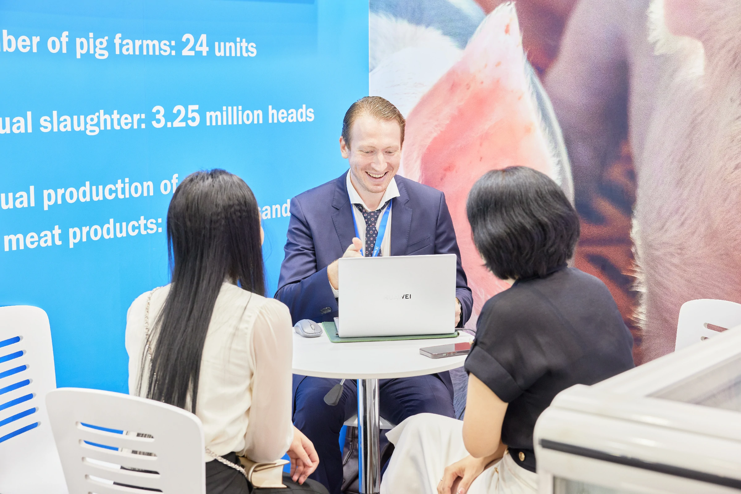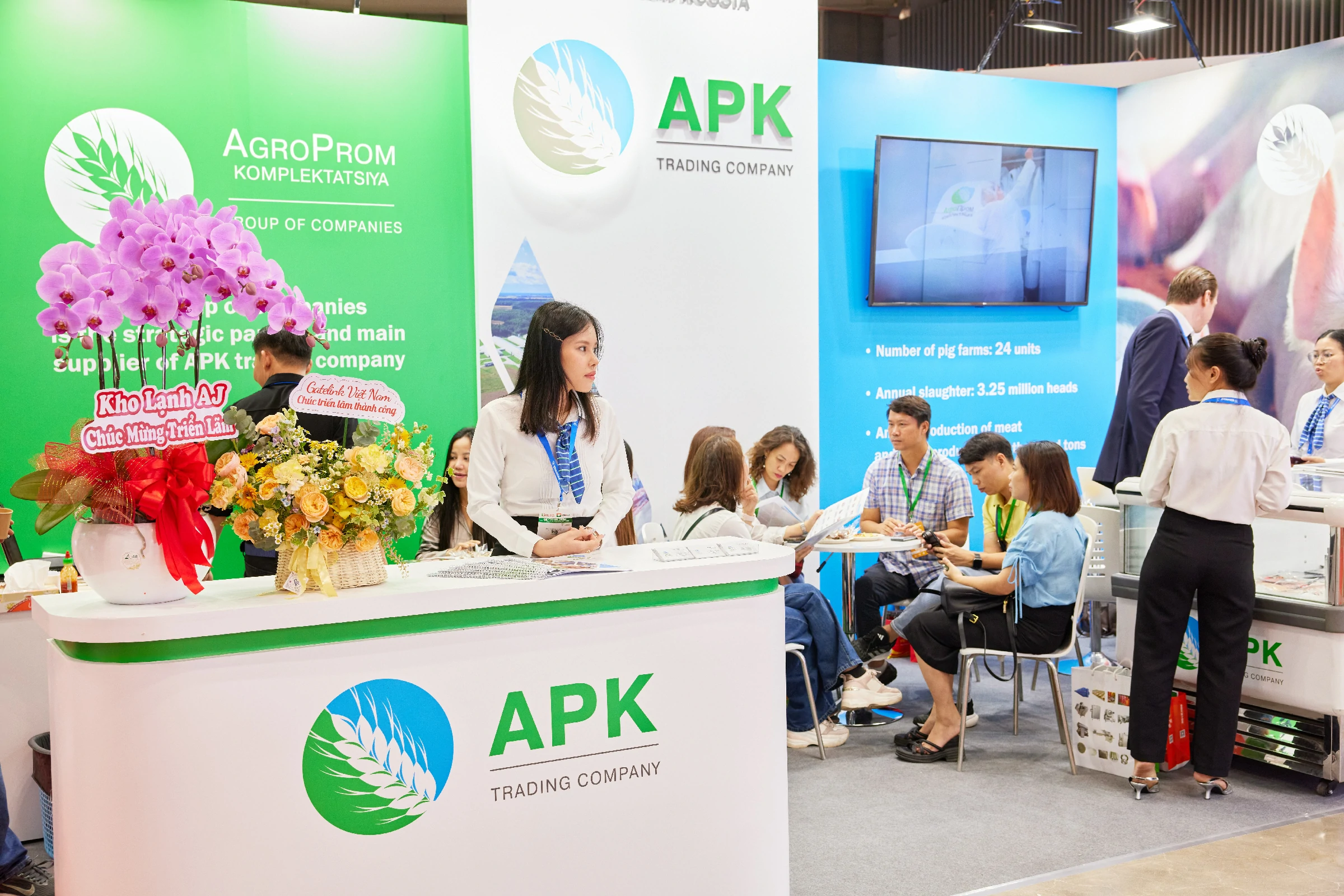 Продукцию свиноводства на брендированном стенде представляла APK Trading company, вьетнамский партнер Группы компаний, который отвечает за дистрибуцию на юго-восточном рынке. Ассортимент выставочной продукции включал замороженное мясо и свиные субпродукты, сырые полуфабрикаты и готовые мясные продукты, которые производятся на высокотехнологичных предприятиях — Курском мясоперерабатывающем заводе (КМПЗ) и Дмитрогорском мясоперерабатывающем заводе (ДМПЗ), расположенных в Курской и Тверской областях.